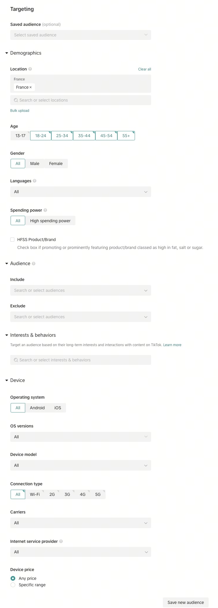 Targeting einrichten: In diesem Abschnitt können Sie festlegen, wer Ihre Anzeigen sehen soll. Zu den Parametern, die Sie festlegen, gehören die Zielgruppe, das Geschlecht, der Standort, das Alter, die Sprachen, die Interessen und Verhaltensweisen sowie das Gerät.